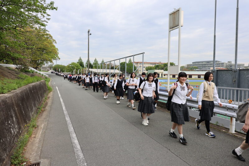 学年を越えての徒歩移動では、クラスの仲間や先輩・後輩と会話も弾み、いつもとは違う景色の中、明るい表情で歩く姿が見られました。